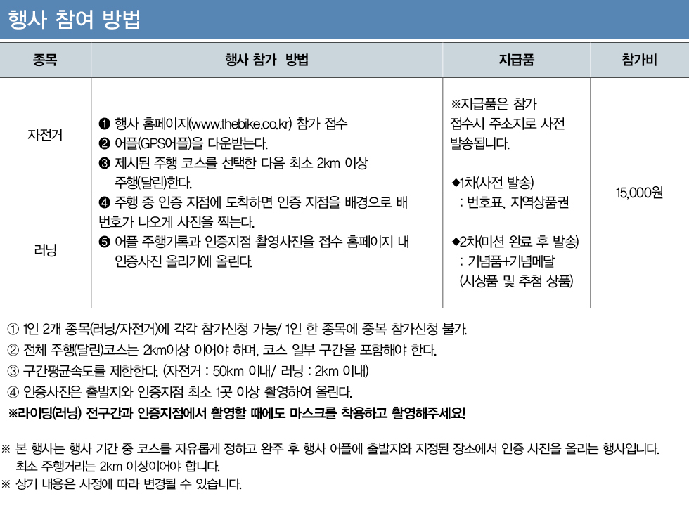 참가 신청자 개인의 안전은 참가자 본인의 책임하에 참여하며, 주행 중(자전거/러닝) 안전사고에 관한 모든 민·형사 책임은 참가자 본인에게 있으며, 사고 발생시 주최 및 주관사에 책임을 물을 수 없습니다. 개인별 상해보험 가입 후 참여를 권합니다.