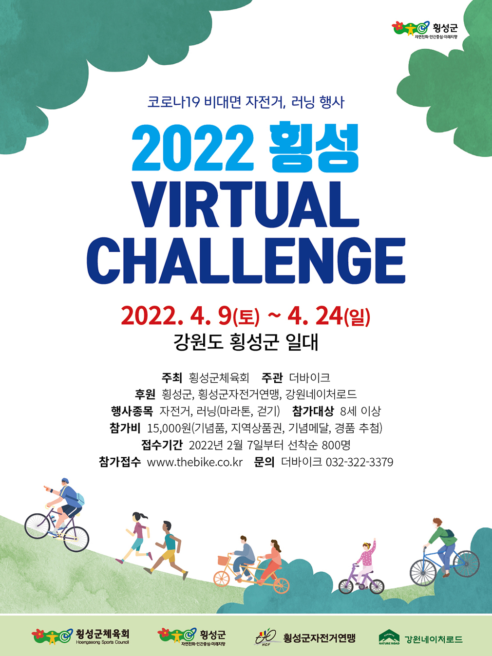2022 횡성 VIRTUAL CHALLENGE는 코로나 상황에 맞게 기획된 비대면 비경쟁 행사로 올해로 2회째인 행사 입니다. 횡성 VIRTUAL CHALLENGE 제안된 4개 코스중 참가자가 코스를 선택하여 어플을 켜고 자전거 또는 러닝(걷기. 마라톤)으로 최소 2km이상을 주행후 인증지점에서 인증 하는 미션형 행사 입니다.또한 완주자를 대상으로 횡성한우, 자전거 용품 등 다양한 경품을 추첨을 통해 제공해 드립니다.