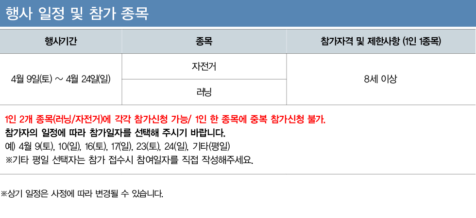 - 본 행사는 4월 9일~24일까지 개인 일정에 따라 자유롭게 참여하는 행사로, 주최측에서 도로통제 및 안전사항 지원이 불가합니다.