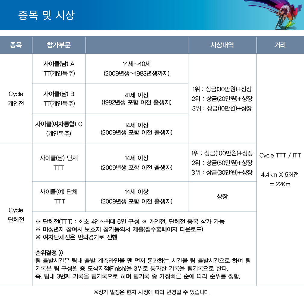 (단, 대한사이클연맹, 철인연맹, 경륜선수로 등록된 엘리트 선수 및 등록 종료 후 3년 이내인 선수는 번외로 만 참여가능 시상제외)