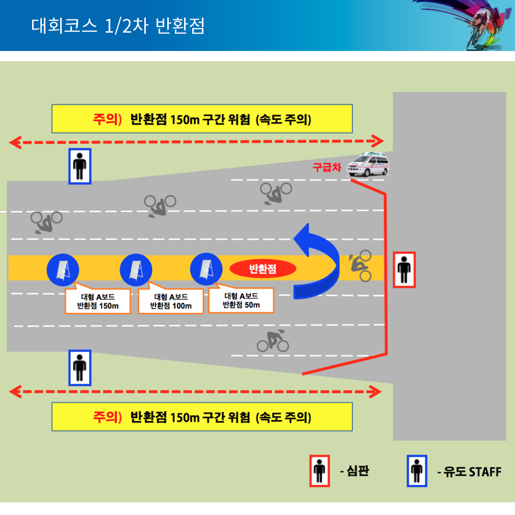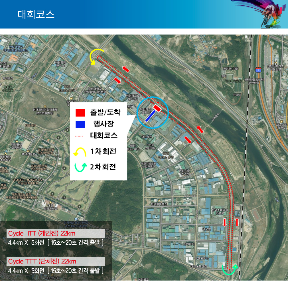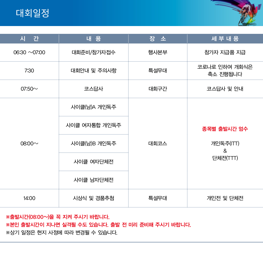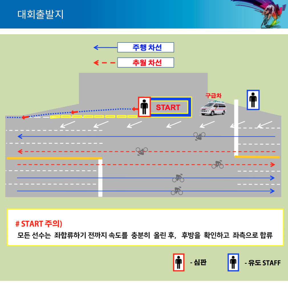 - 출발 방법(TTT) - 팀별 출발(팀 출발 간격 1초~20초), 팀구성은 4명 이상 최대 6명이며 출발은 최소 4명 이상이며 골인은 4명이 아니어도 무관함.