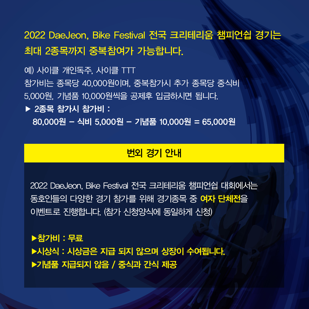 참가비: 1종목 참여시: 40,000원 /2종목참여시: 65,000원/사이클(여)단체전: 참가비 무료