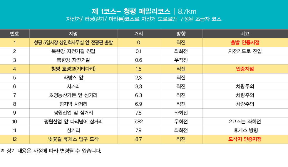 * 제1코스~제2코스 중 최소 한 개의 코스를 선택하여 코스당 최소 5km 이상을 주행한다.