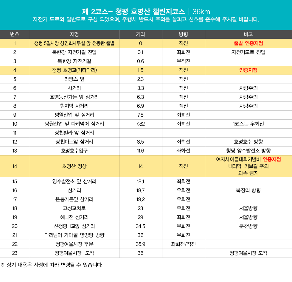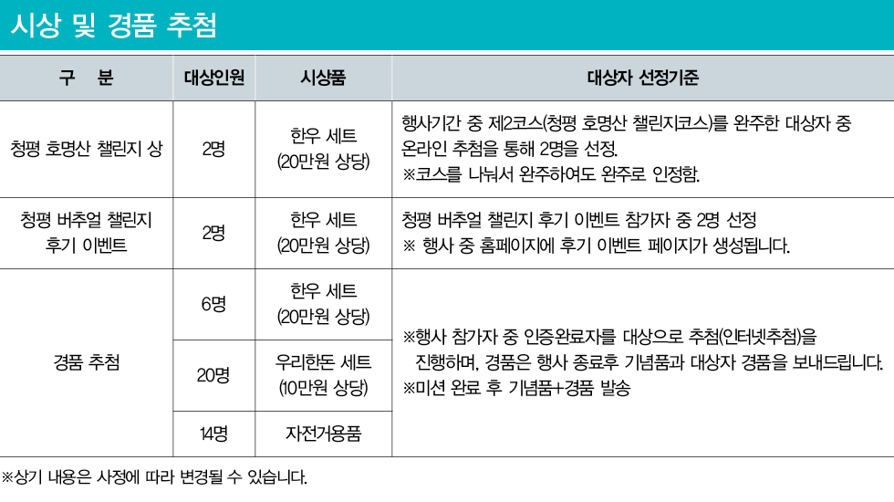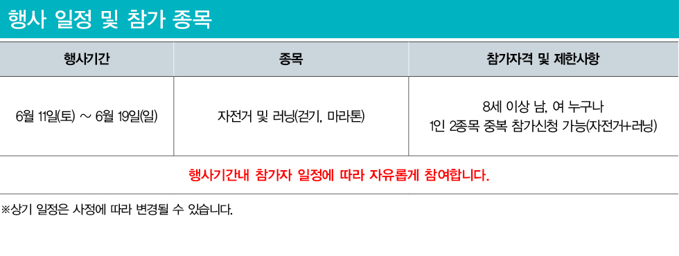 - 본 행사는 6월 11일(토) ~ 9월 19일(일)까지 개인 일정에 따라 자유롭게 참여하는 행사로, 주최측에서 도로통제 및 안전사항 지원이 불가합니다.