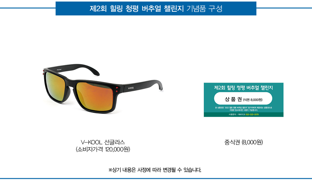 ▶ 기념품발송 : 미션 완료자를 대상으로 기념품(12만원 상당 V-KOOL스포츠 선글라스)와 이벤트 시상 및 경품추첨 대상이 됩니다.
