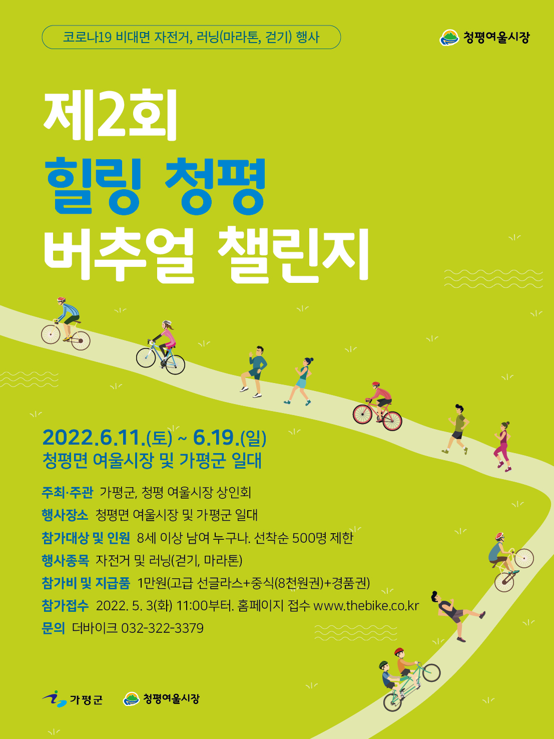 2022 힐링 청평 버추얼 챌린지는 자전거 라이딩 관련 어플을 이용하여, 행사 기간 내(6월 11일 ~ 6월 19일)에 자유롭게 참여하는 행사입니다.