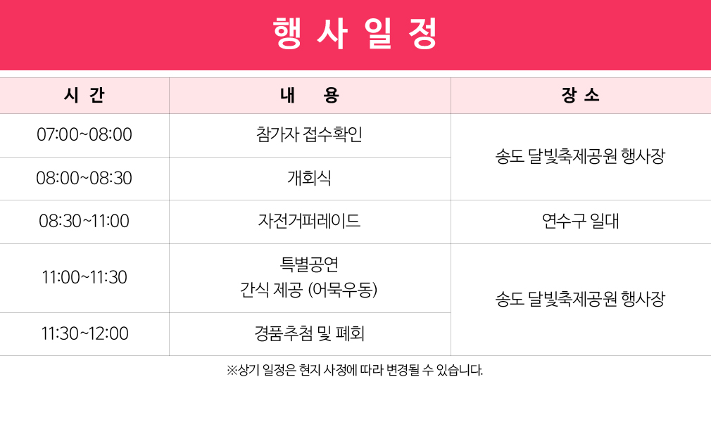 천재지변이나 자연재해 발생으로 행사개최가 불가능할 경우, 연기또는 취소되며 참가비는 환불되지 않습니다.