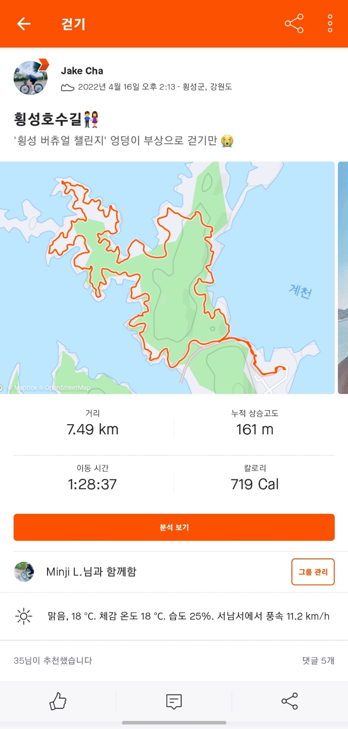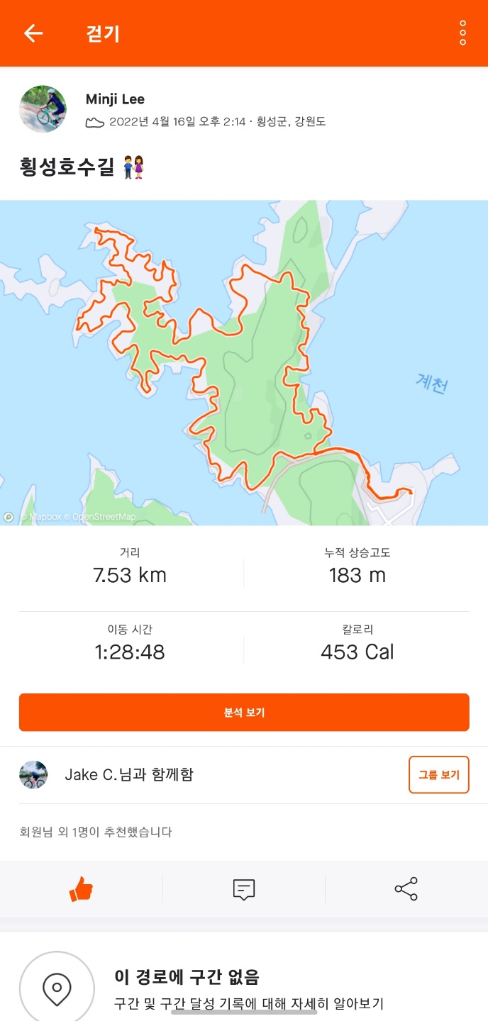 부상으로 라이딩은 못하고 횡성 호수길 걷고 왔네요.