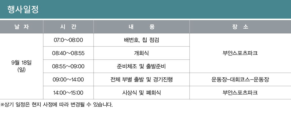 -주최측은 참가자의 안전에 필요하다고 판단 될 경우 참가자의 동의 없이도 코스의 길이 및 경로를 변경 할 수 있다.