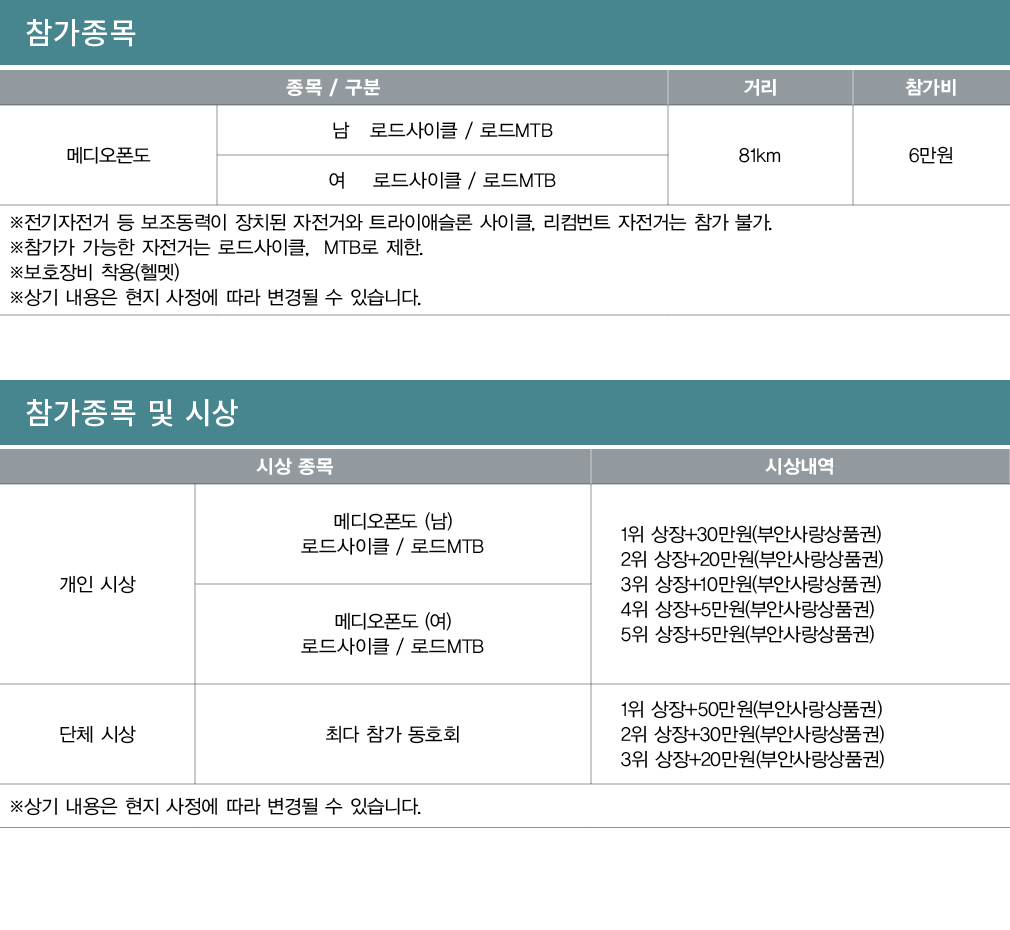 -참가가 가능한 자전거는 로드사이클, MTB로 제한됩니다.(철인용자전거/U바착용 자전거 참여는 가능하나 시상은 제외됨)