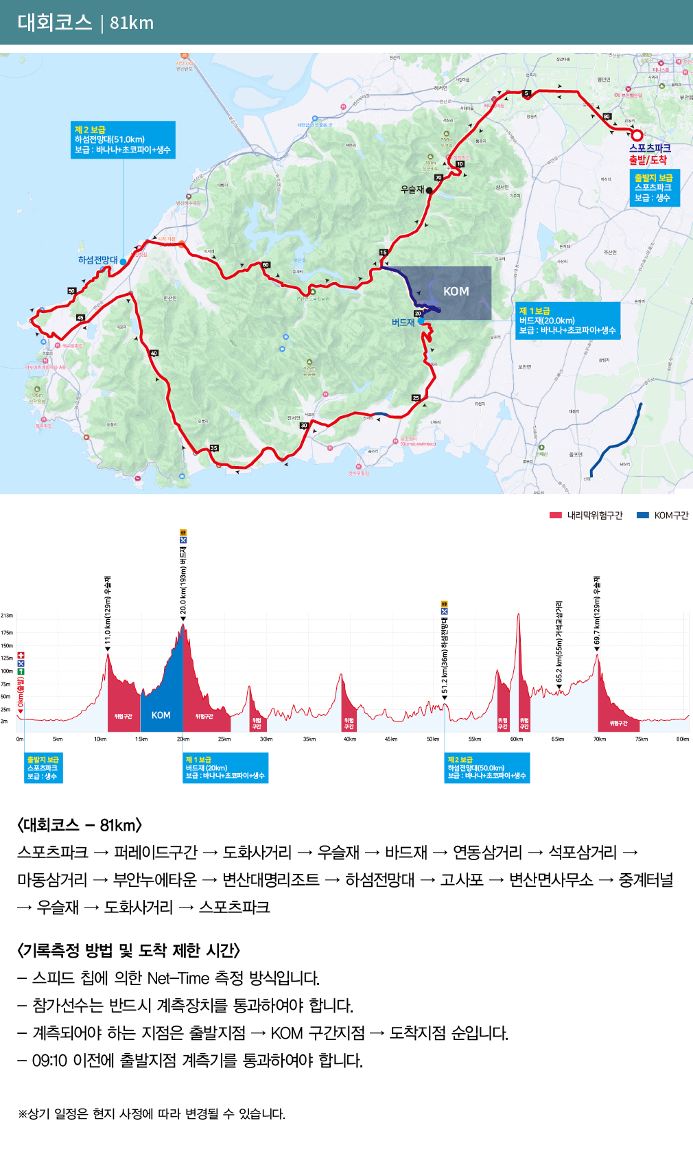 (즉, 개인기록은 넷타임으로 부여되며, 순위는KOM구간을 측정하여 부문별 시상(순위시상1~5위)합니다.)