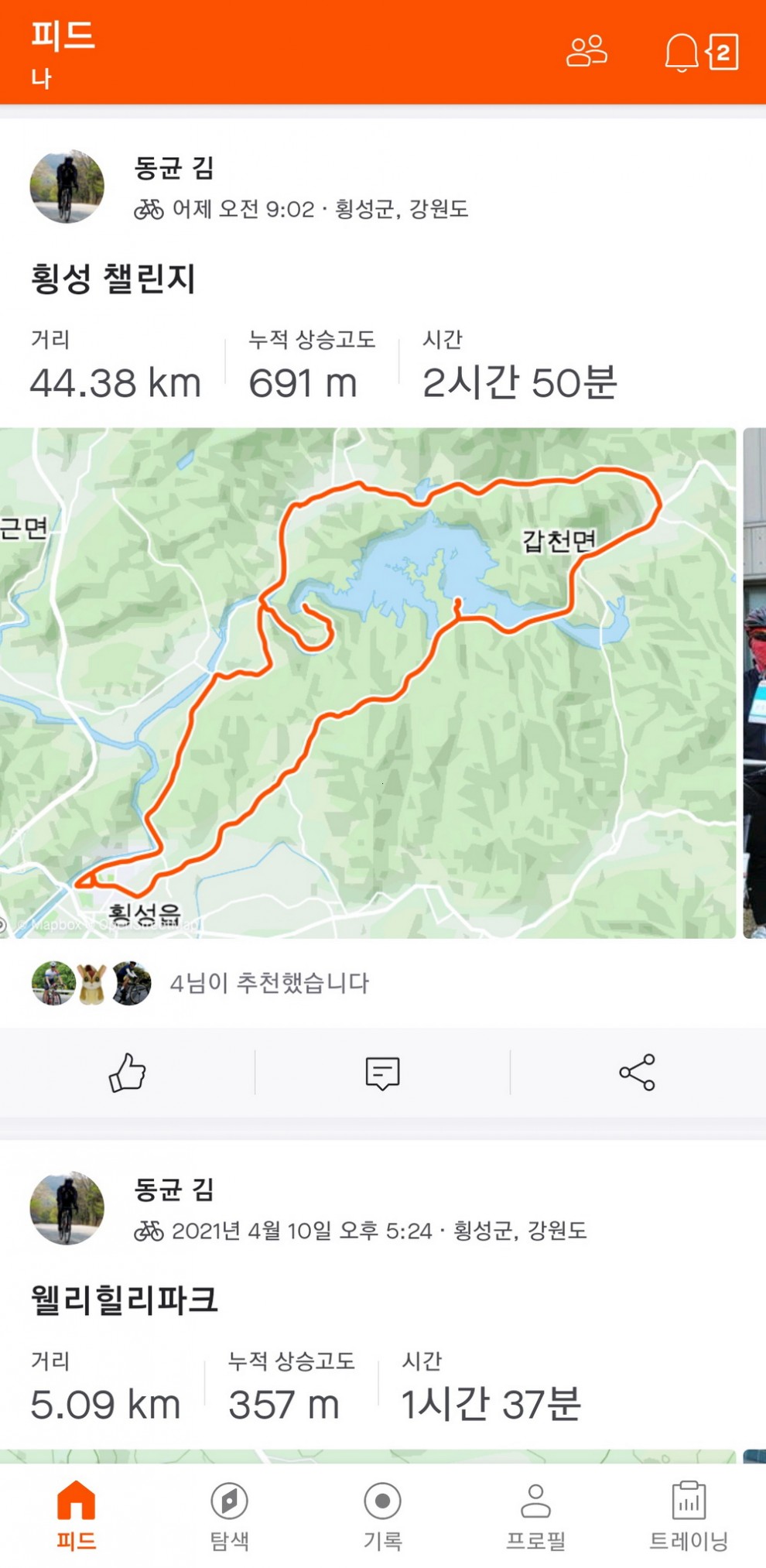 가민에 1코스 챌린지 도로.gpx를 다운받아 지도 맵을 보면서 가다가1.6.km삼거리에서 직진해야 하는데 직진과 우회전길 모두 붉은색으로 되어 있어 우회전을 했는데 고개를 몇개 넘어 힘들게 횡성댐입구 삼거리에 도착하여 한참 헤매다가 힘들어 물문화원 찾았답니다. 그다음부터는 코스표를 참고로 제대로 완주했네요. 덕분에 원래코스보다 조금 더 타는 행운을 가졌습니다.