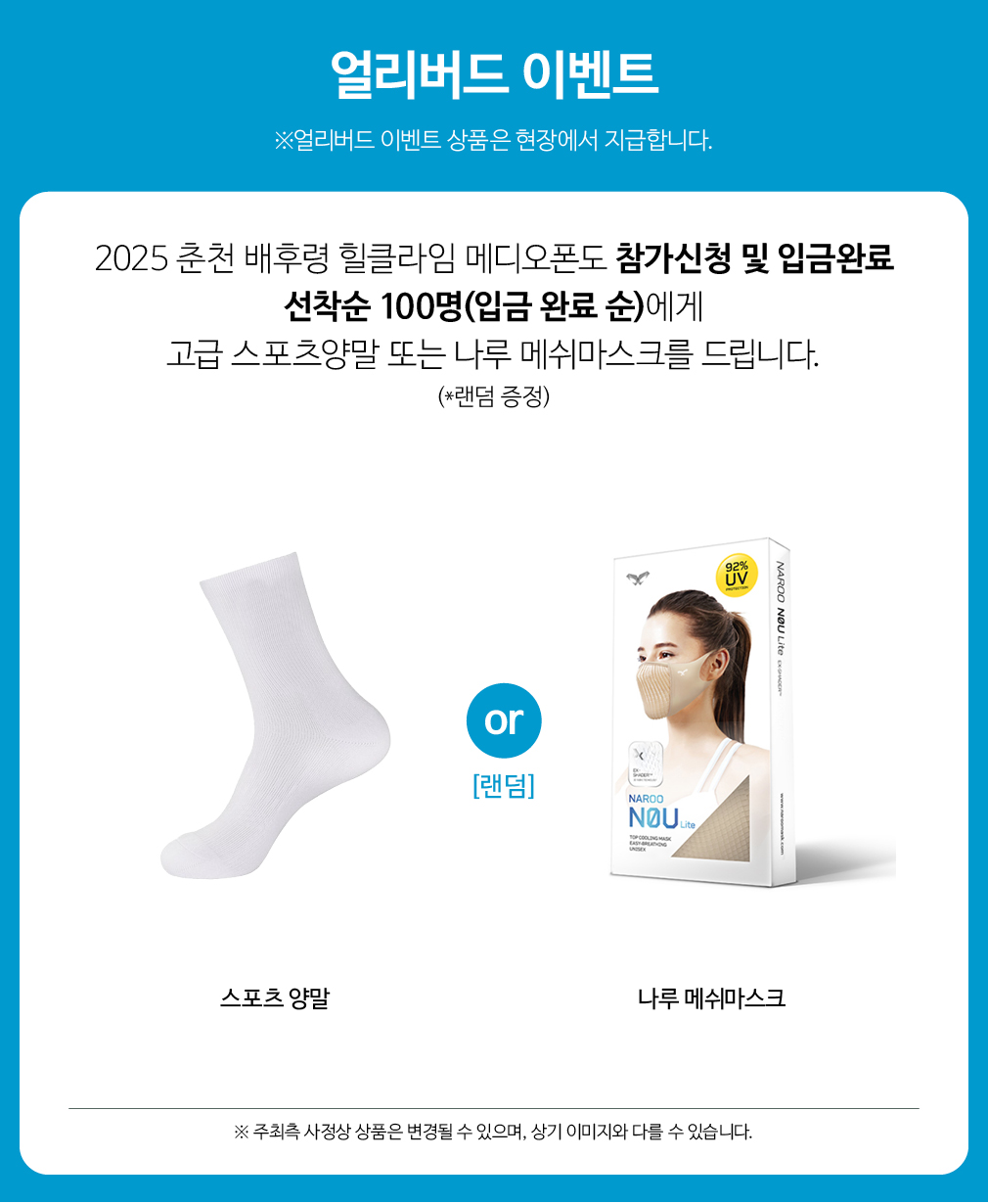참가자가 개별 보험에 가입하지 않아 생긴 그 어떤 위험에 대해서도 주최측은 현장 응급조치 및 위급 시 병원후송조치 외에 그 어떠한 책임도 지지 않으며 가입된 보험(주최자 배상책임보험) 외에 혜택을 받을 수 없음을 명시합니다. 또한 2차 병원 후송의 경우 본인이 부담해야 합니다.