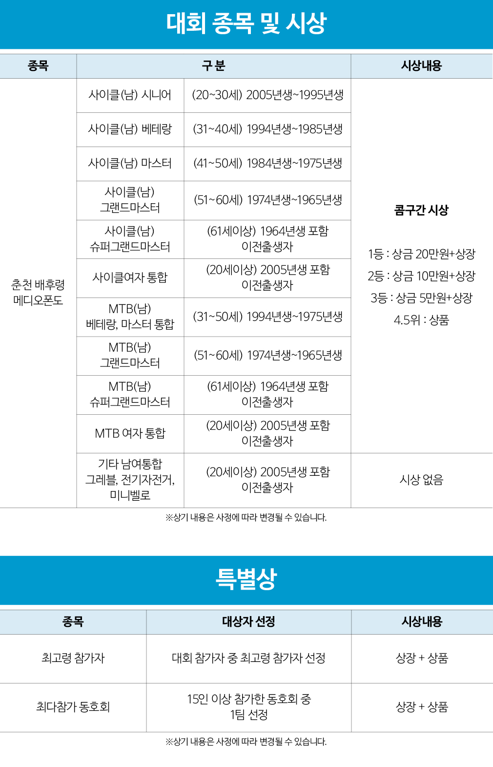 ※단, 대한사이클연맹, 철인연맹, 경륜선수로 등록된 엘리트 선수 및 등록 종료 후 3년 이내인 선수는 번외로만 참여가능 시상제외)