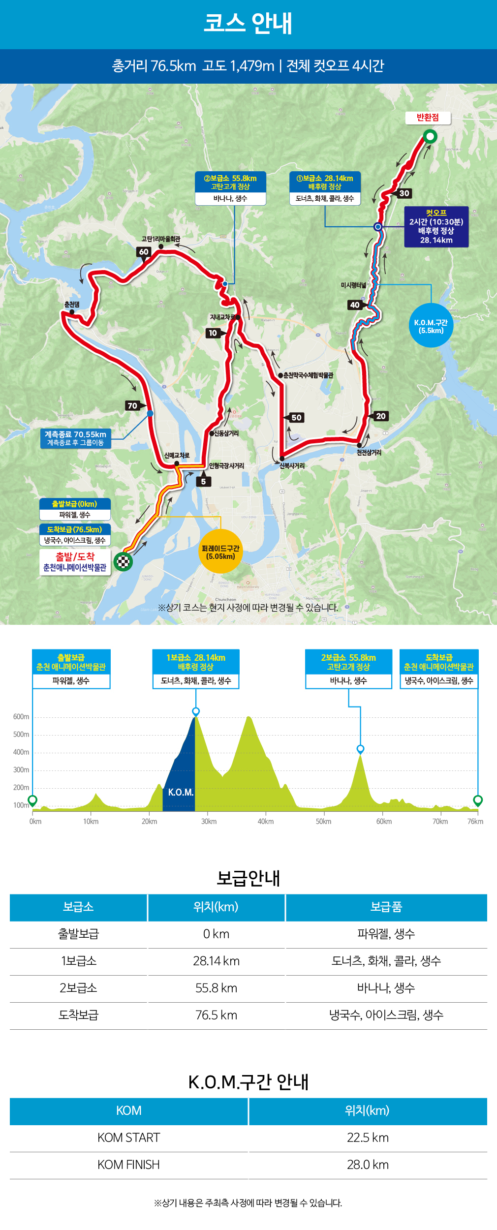 본 행사는 비경쟁 메디오 폰도 행사로 일부 구간(고탄고개, 배후령구간)을 제외한 모든 구간을 도로교통법을 준수하여야 합니다.
