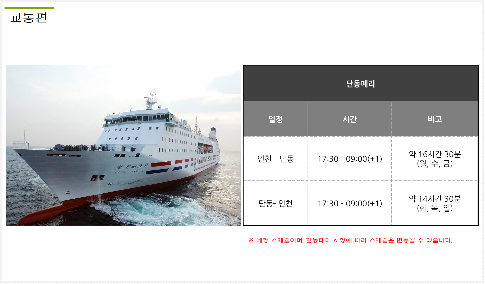 본행사 교통수단(배:단동페리)로 운항 중 자전거는 보관소에 일괄 보관합니다.(보관비는 왕복 2만원으로 참가비에 포함되어 있습니다.)