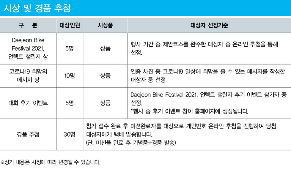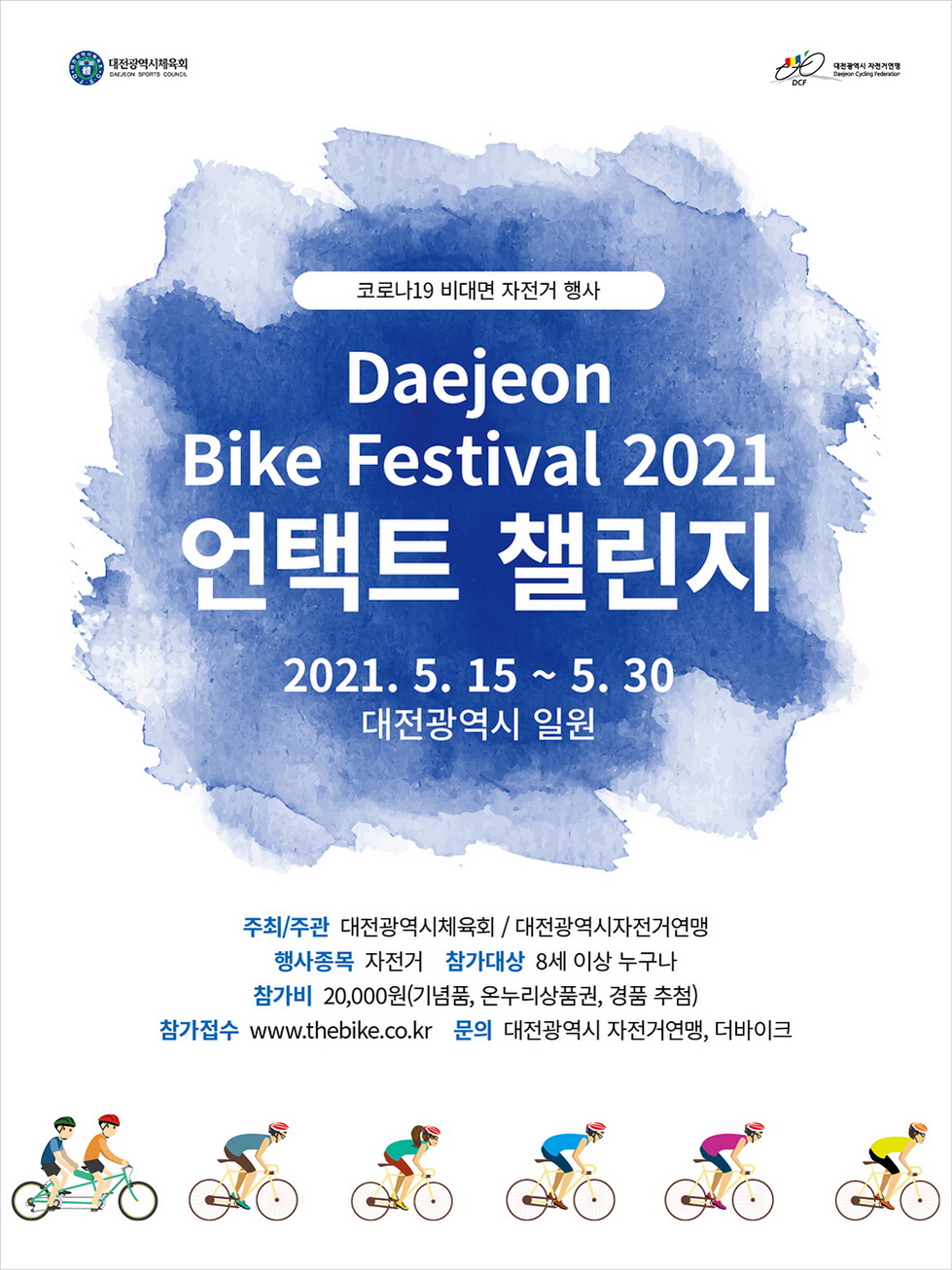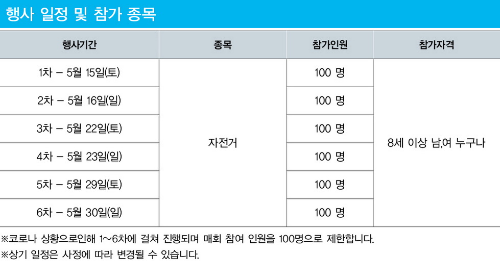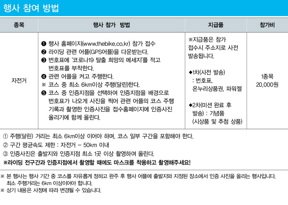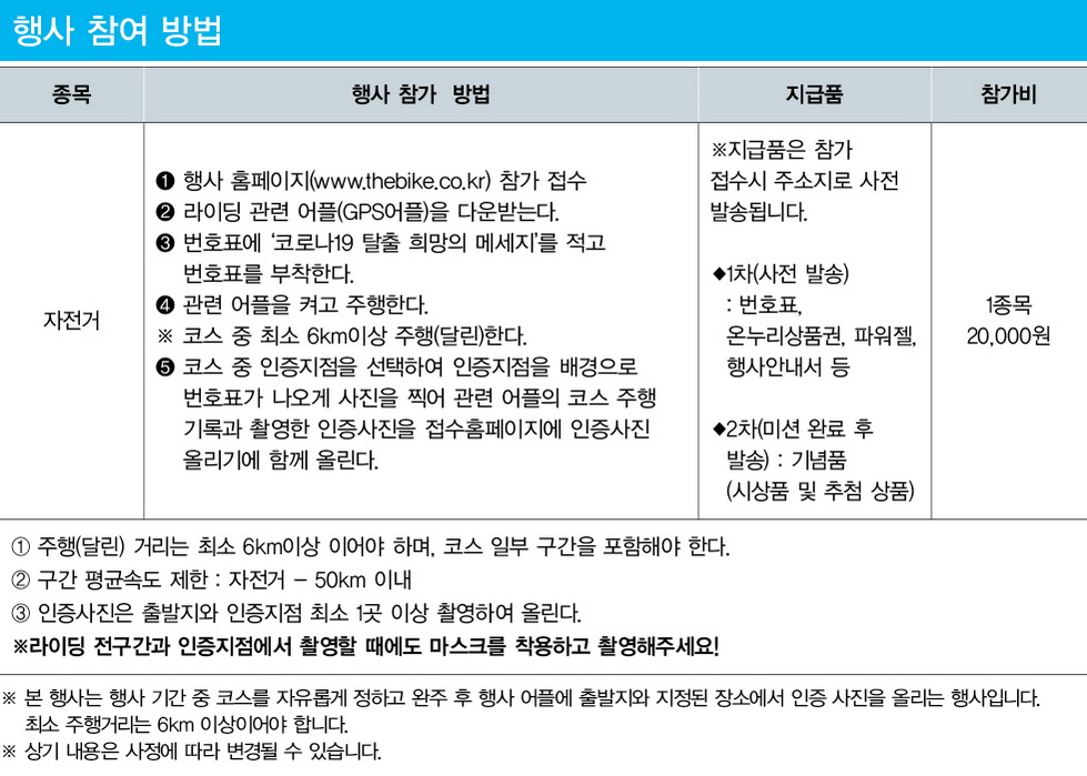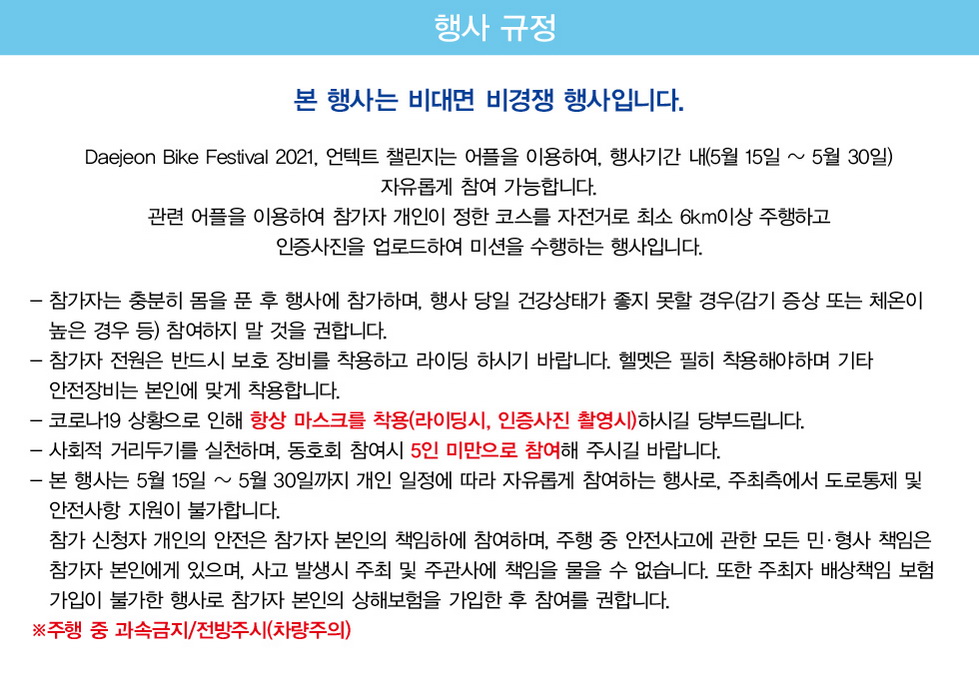 본 행사는 코로나상황 맞게 새롭게 만들어진 비대면,비경쟁방식 행사로,행사기간(5월 15,16,22,23,29,30일(6일간)) 중 주최측에서 어떠한 안전사항 지원(교통통제 등)이 불가하며, 참가자 본인의 판단하에 참여하는 행사임을 알려드립니다.