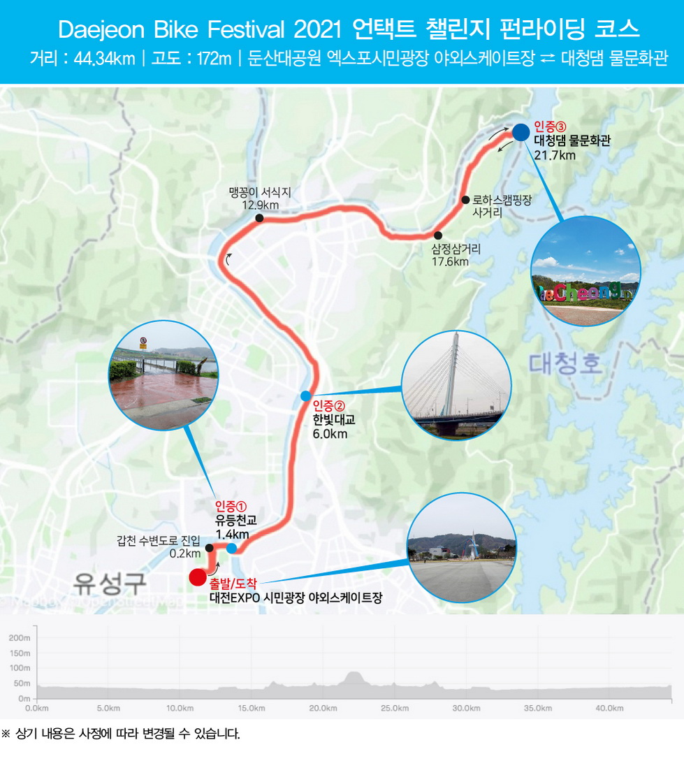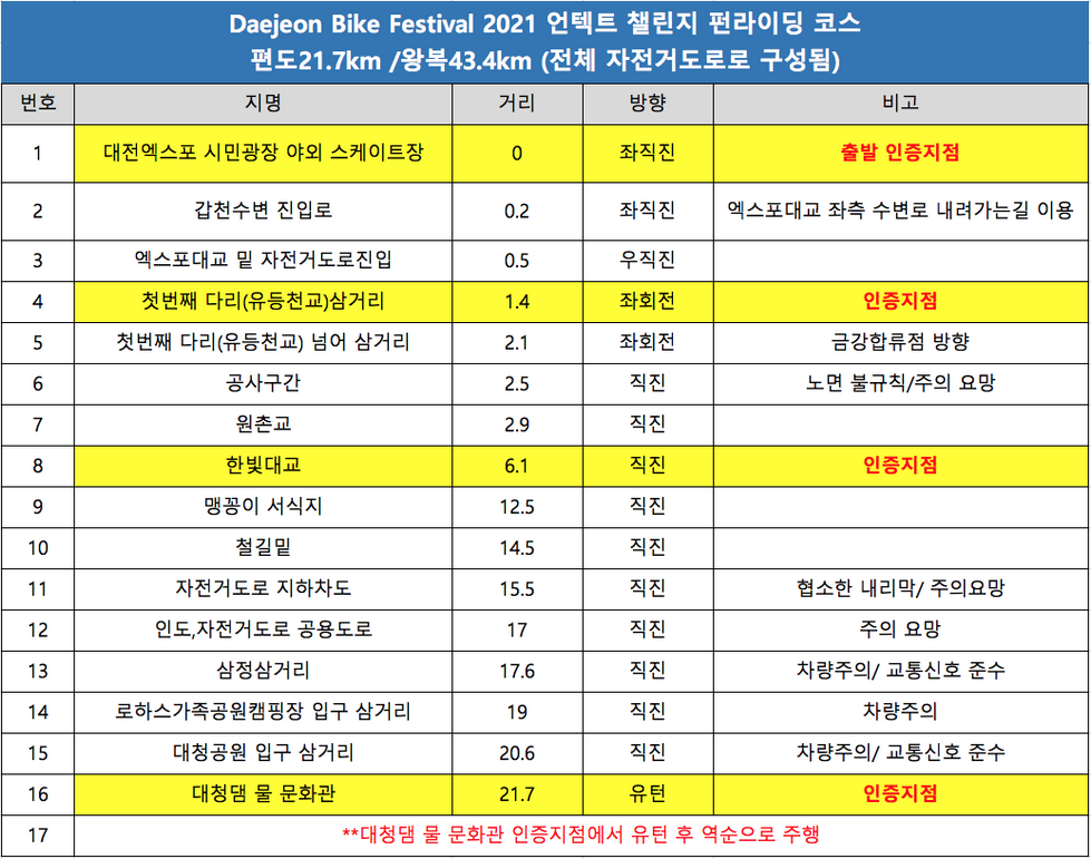 * 제시한 코스(대전 펀라이딩 코스-43.4km) 중 최소 6km 이상을 주행한다.
