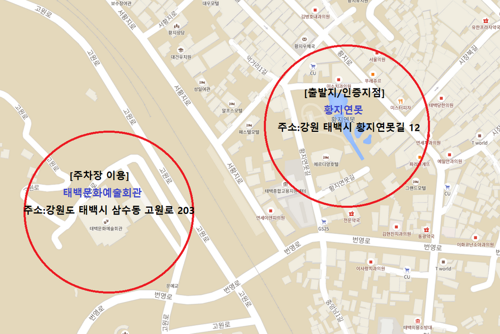 (태백예술문화원에서 황지연못 이동시 차량이동이 많은 내리막으로 주의하시길 바랍니다.)