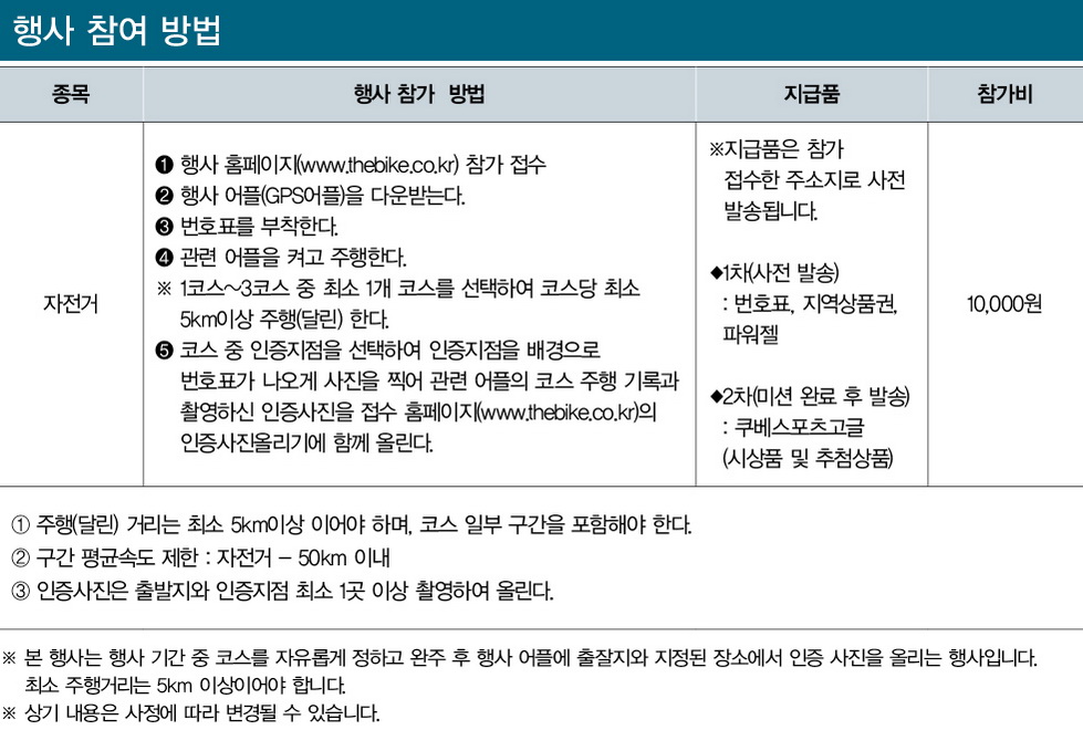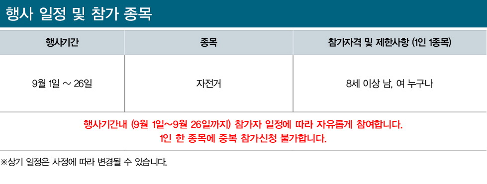 - 본 행사는 9월 1일~26일까지 개인 일정에 따라 자유롭게 참여하는 행사로, 주최측에서 도로통제 및 안전사항 지원이 불가합니다.