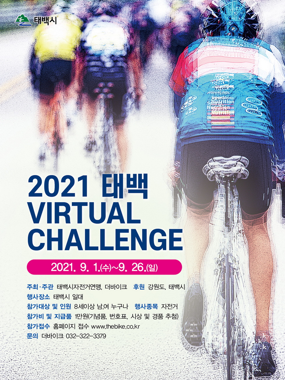 2021 태백 버추얼 챌린지는 자전거 라이딩 관련 어플을 이용하여, 행사 기간 내(2021. 09.01~26)에 자유롭게 참여 하는 행사입니다.