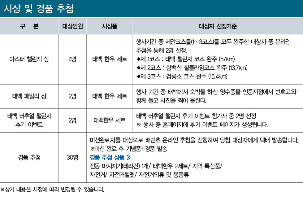 ※제1코스(태백챌린지코스)는 일부 위험구간이 포함되어 있으므로 특별히 주의해 주시길 바라며,제1코스는 중급 이상의 실력자(1시간 평균속도 30km 이상자)만 주행하시길 바랍니다.