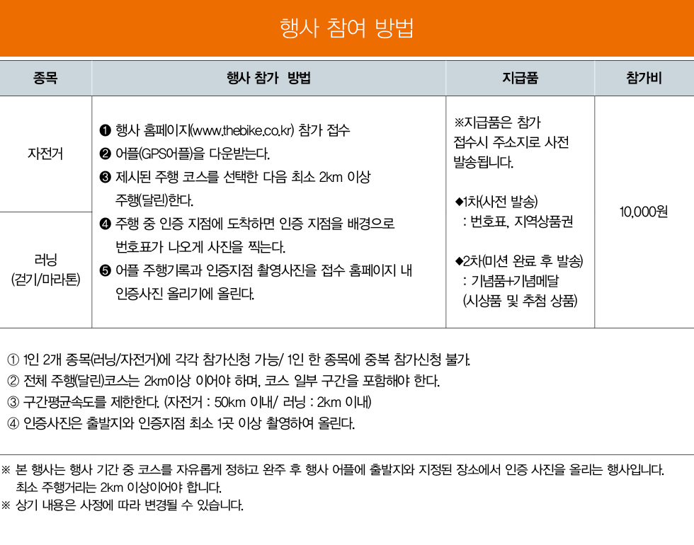 - 참가자는 충분히 몸을 푼 후 행사에 참가하며, 행사 당일 건강상태가 좋지않을 경우(감기증상, 체온이 높은 경우 등) 참여하지 말 것을 권합니다.