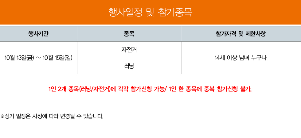 ‘본행사는 행사기간(2023. 10.13.~10.15.) 중 주최측에서 어떠한 안전사항 지원(안전요원, 교통통제, 안전표지 등)이 불가하며, 참가자 본인의 판단하에 참여하는 행사입니다.
