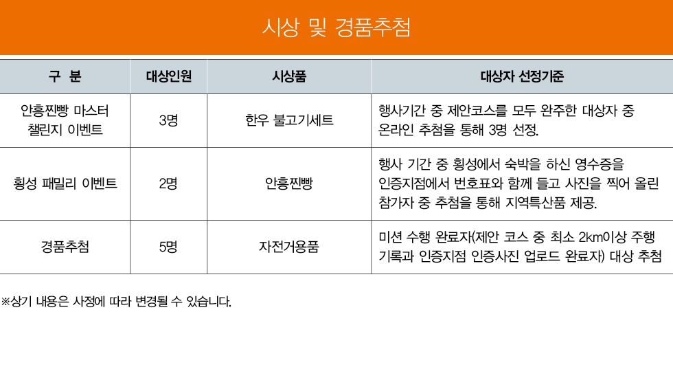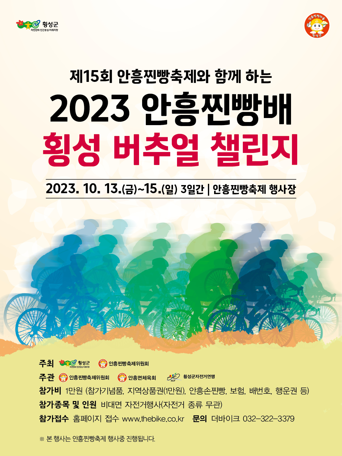 안흥찐빵 축제와 함께 하는 안흥찐빵배 횡성 버추얼 챌린지는 라이딩 관련 어플을 이용하여, 안흥찐빵 축제 기간 내(2023. 10.13.~10.15.)에 자전거와 러닝(걷기/마라톤)을 자유롭게 참여 하는 행사입니다.