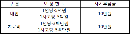 - 보험료 지급은 아래 지급한도내에서 지급되며 ,지급은 자기부담금을 공제후 지급됩니다.