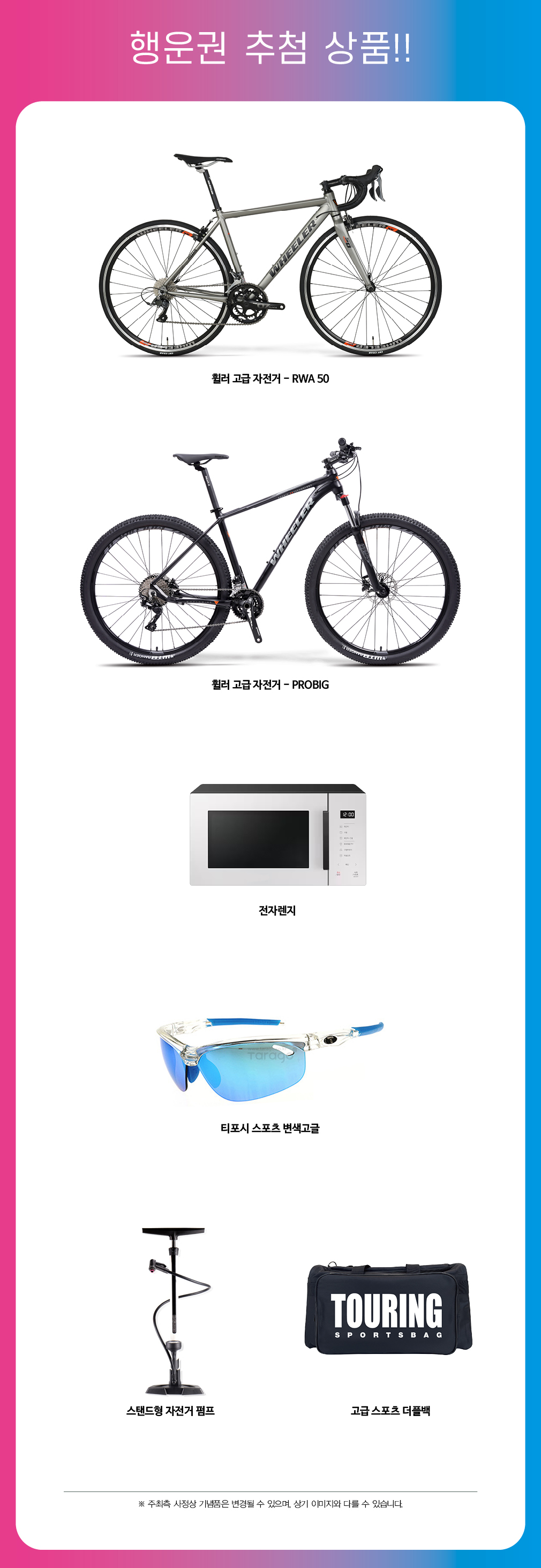특히 이번 대회의 후원 업체인 휠러코리아에서 고급 자전거등 푸짐한 경품을 후원하여 참가자에게 추첨을 통해 지급될 예정입니다.