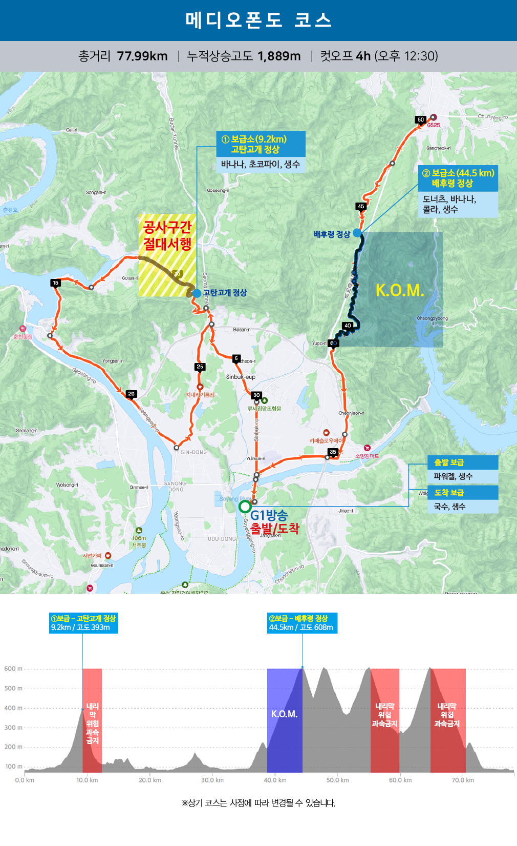 대회 코스는 G1방송에서 출발하여 고탄고개,배후령,배후령 리버스후 G1방송으로 도착 하는 약 77.9km코스 입니다.