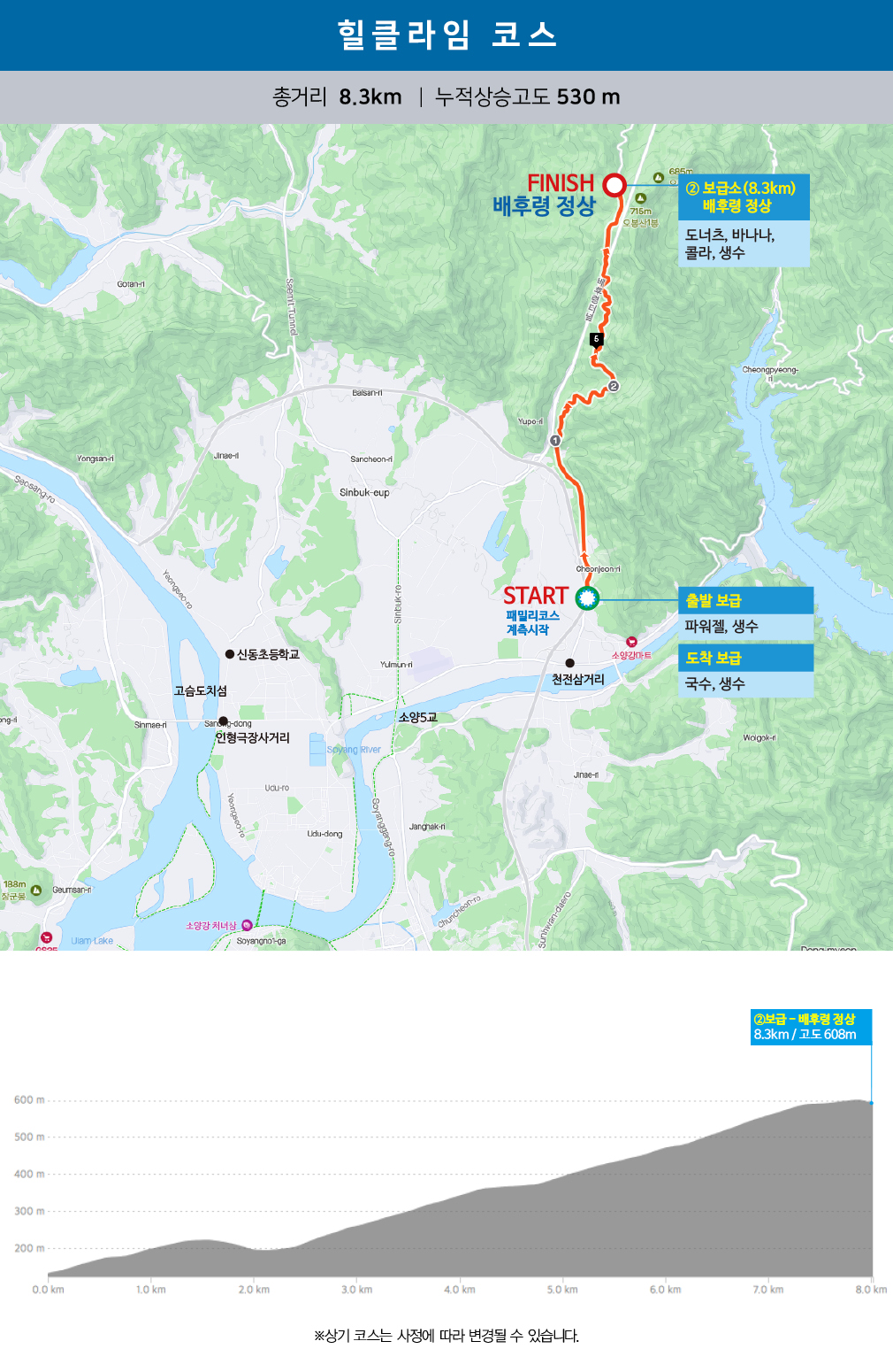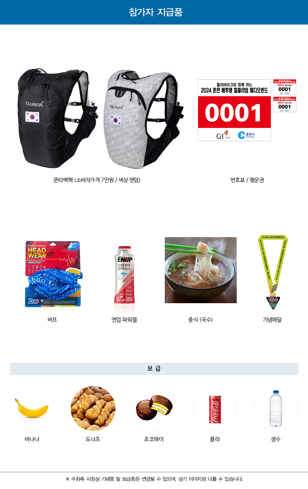 ※ 물은 선수에게만 지급되며, 참가자는 출발전 개인 휴대용 물통에 완충 하시고 출발 하시길 바랍니다.