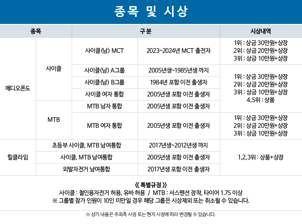 ※ 하이브리드자전거, 리컴번트 등 참가신청은 MTB부문으로 신청가능 (단, 시상에서는 제외됨)