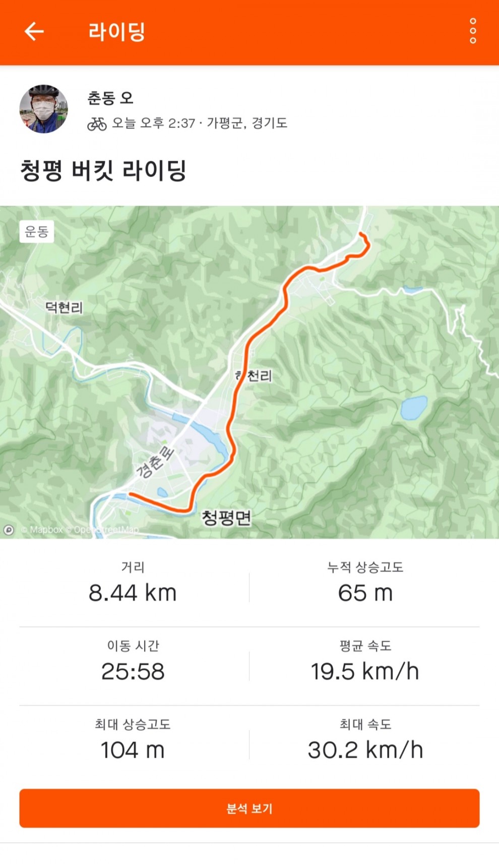 힐링청평버추얼챌린지 | 제목 : 379 조회수 : 3,378 12일 청평 버츄얼 라이딩 참가 초행길이라 조금 헤맨것 빼곤 좋았습니다. 다음에 시간되면 춘천에서 청평까지 라이딩 해보고 싶네요. 등록된 댓글이 없습니다.
