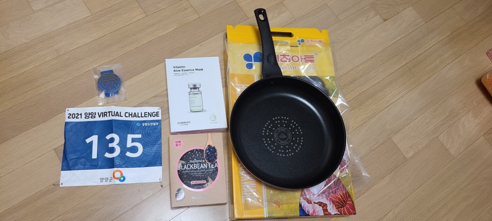 강원사랑상품권, 기념품(후라이팬, 마스크팩세트), 경품당첨(마스크팩세트2), 기념메달. 푸짐하게 주셔서