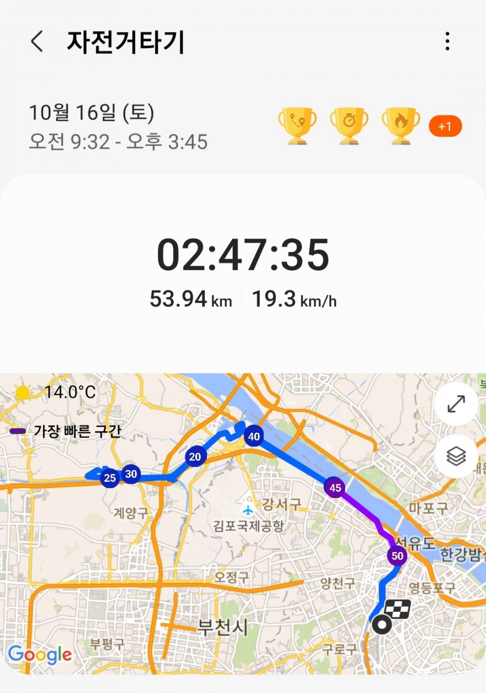 안양천 - 합수부 - 한강자전거도로 - 아라뱃길 - 아라마루휴게소 인근까지 왕복 54km정도 주행했네요~