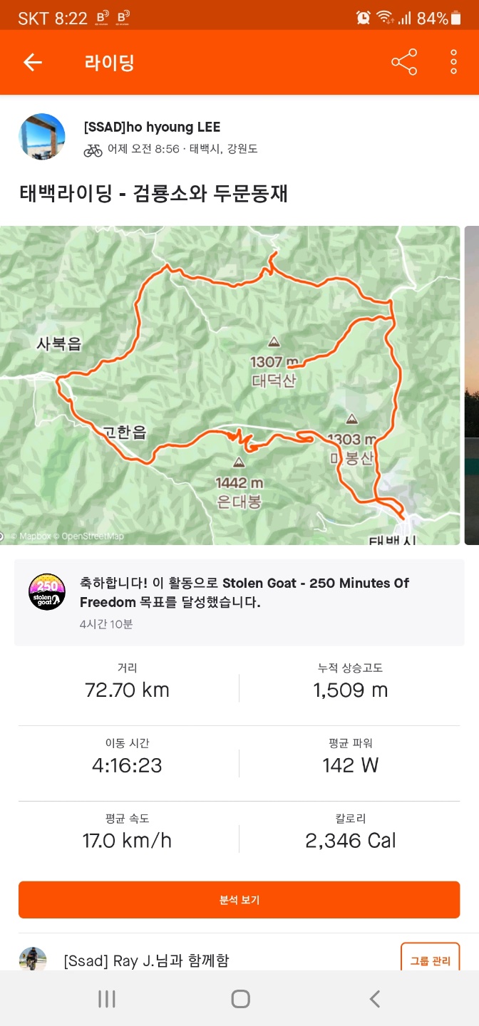 너무 긴 업힐과 많은 차들, 그리고 그 차량들의 위협 속에서 생명의 위협을 느끼며, 두문동재까지 잘 마무리하고 복귀하였습니다.
