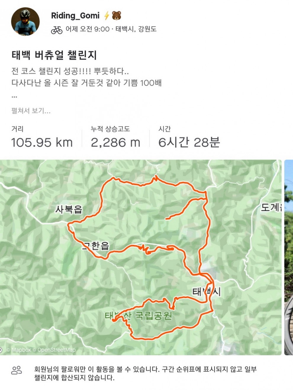 태백버추얼챌린지 | 제목 : 마스터 63 조회수 : 2,663 태백 버츄얼 챌린지 마스터 인증입니다. 황지연못 - 만항재 - 검룡소 - 두문동재 팀먼쓸리 63 전동권 태백시 사회적 거리두기 수칙을 준수하여 라이딩 하였습니다. 등록된 댓글이 없습니다.