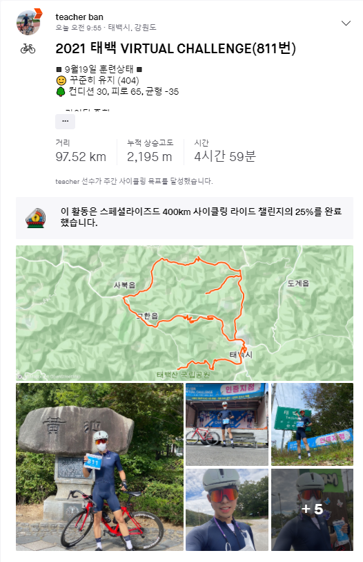 스트라바 기록 인증 ( https://www.strava.com/activities/5983417178 ) - 총 97.52km 획득고도 2195m