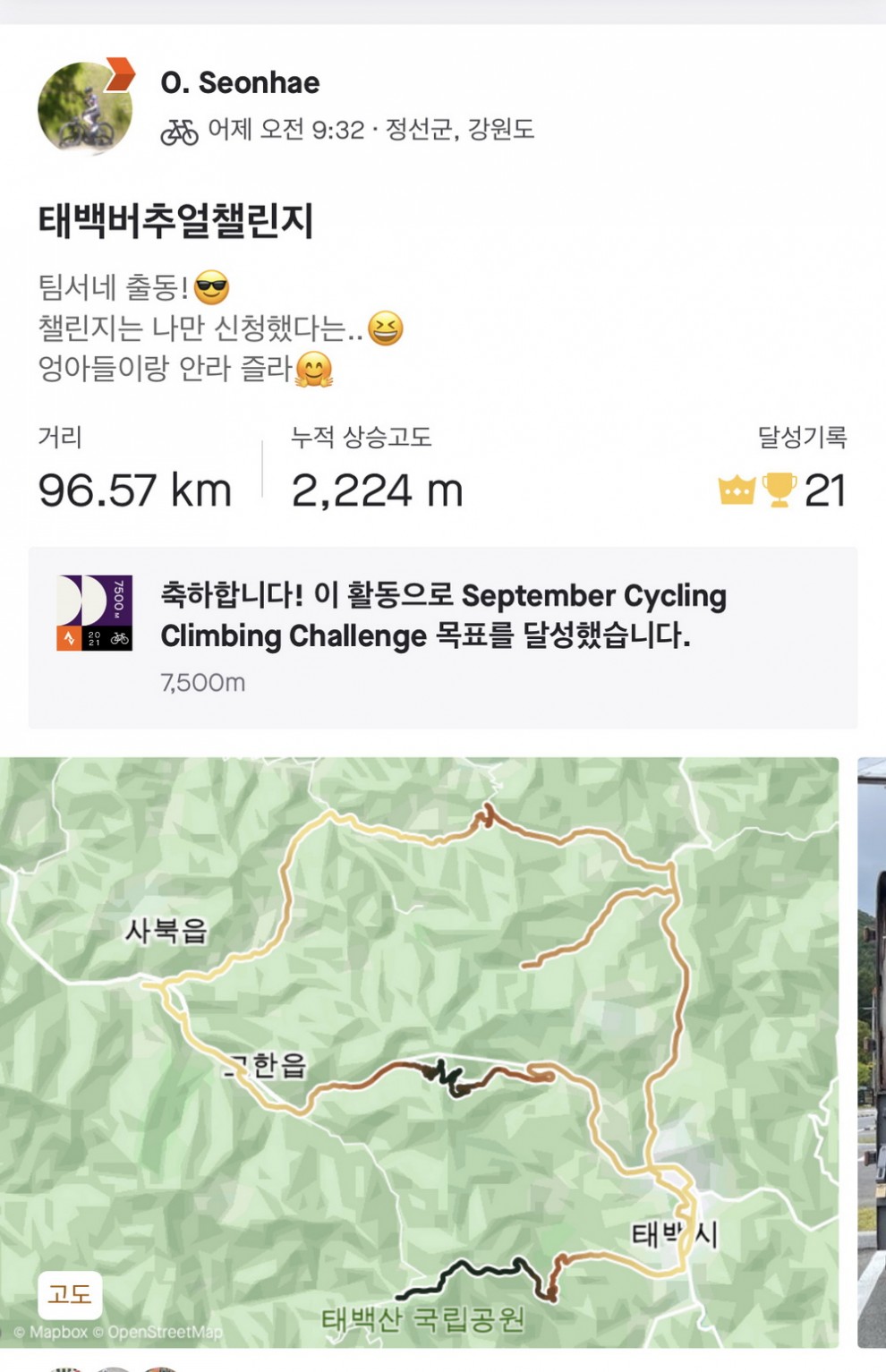 태백버추얼챌린지 | 제목 : 841 조회수 : 6,130 참가번호 841 인증합니다. 배번호 동봉된 에너지젤 터져서 베렸어요 ㅠㅠ 더바이크 21-09-22 09:47 고생 많으셨습니다.^^ 고생 많으셨습니다.^^