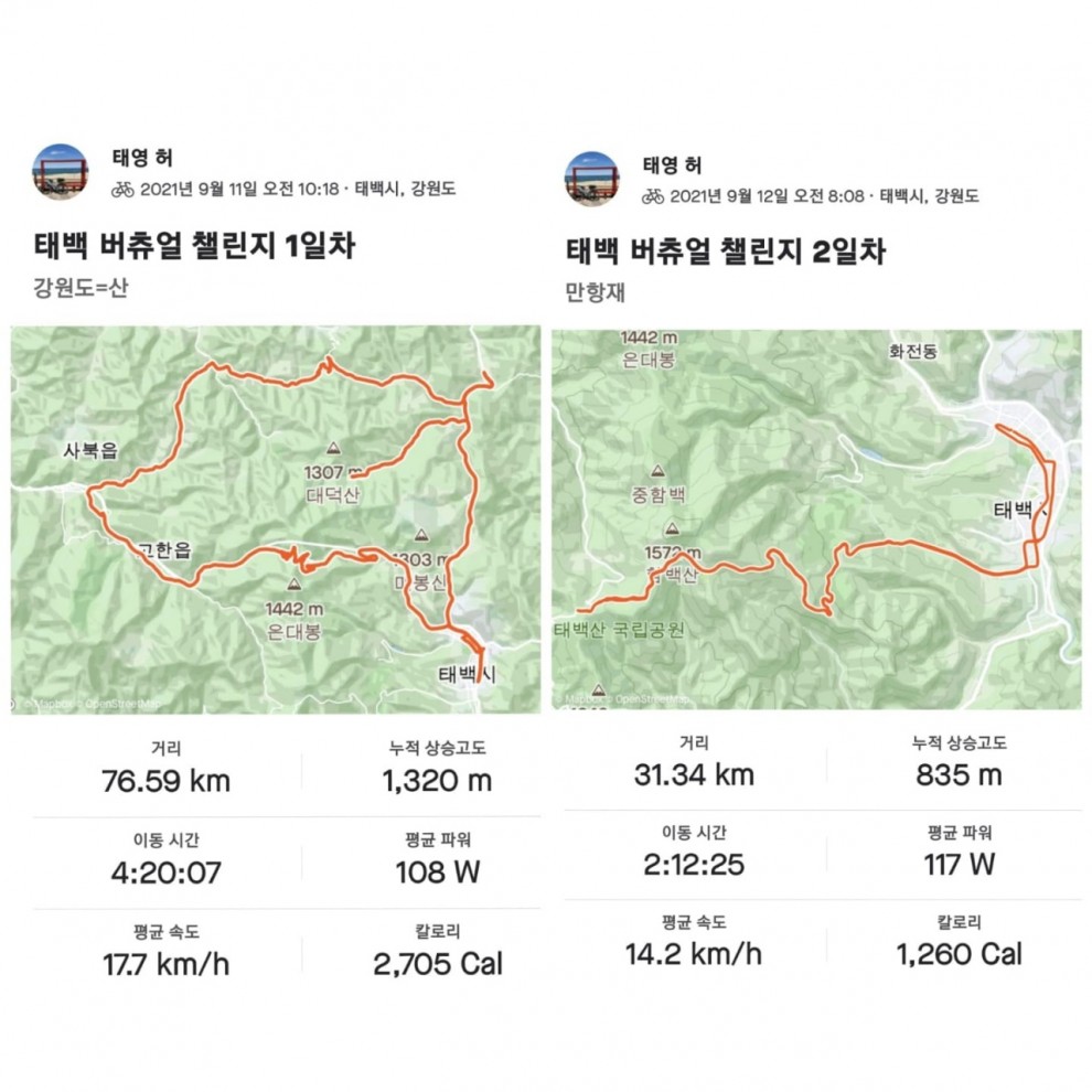 태백버추얼챌린지 | 제목 : 마스터 패밀리 116 조회수 : 3,364 참가자 허태영 마스터 및 패밀리 완료 더바이크 21-09-22 09:50 고생 많으셨습니다.마스터 부문(1.2.3코스완주)/패밀리 부문(숙박) 모두 확인했습니다. 참여해 주셔서 감사합니다.^^ 고생 많으셨습니다.마스터 부문(1.2.3코스완주)/패밀리 부문(숙박) 모두 확인했습니다. 참여해 주셔서 감사합니다.^^