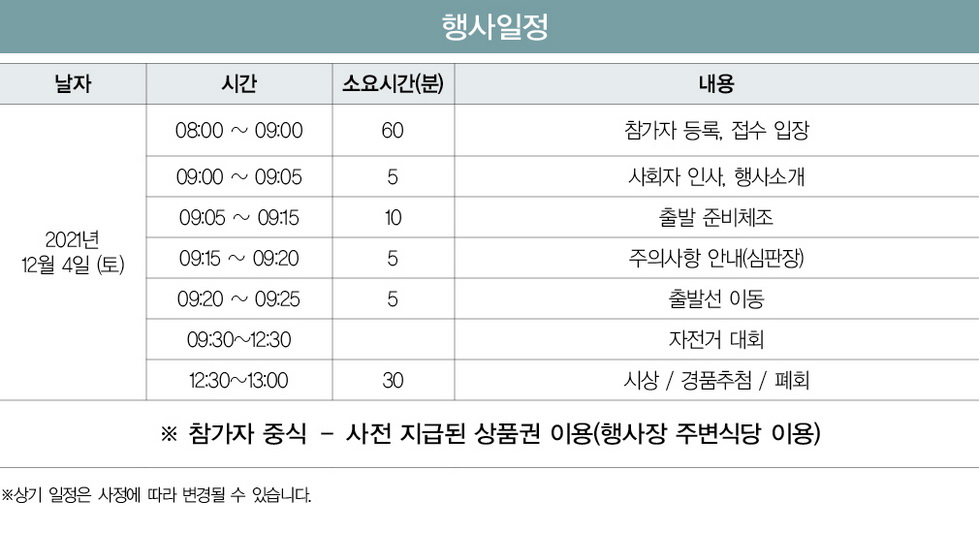 2) 행사중 발생되는 자전거 또는 부품 파손으로 인한 손해는 참가자 본인이 모든 비용을 부담해야 합니다.