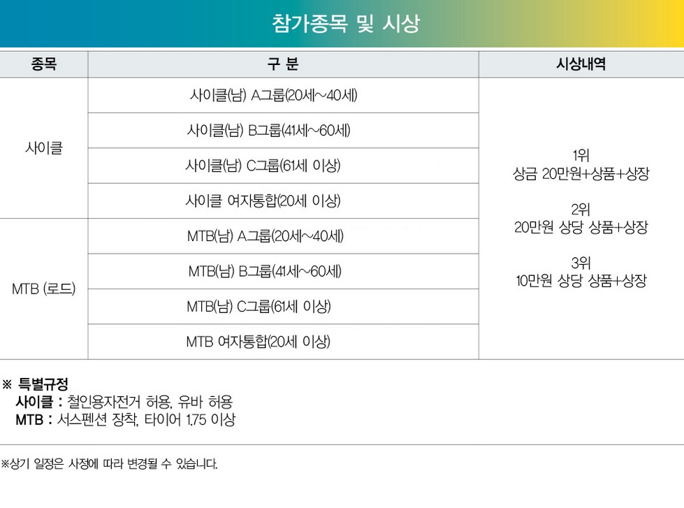 ※미니벨로, 하이브리드, 리컨번트 자전거 참가신청은 MTB부문으로 신청가능 (단, 시상에서는 제외됨)