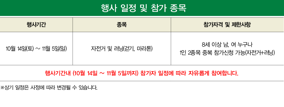- 본 행사는 10월 14일~11월 05일까지 개인 일정에 따라 자유롭게 참여하는 행사로, 주최측에서 도로통제 및 안전사항 지원이 불가합니다.