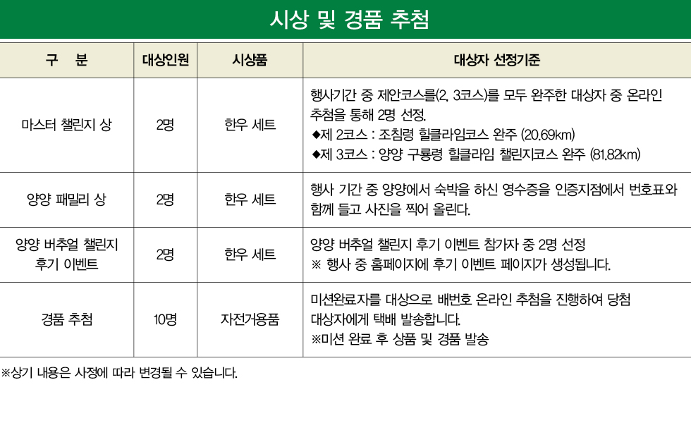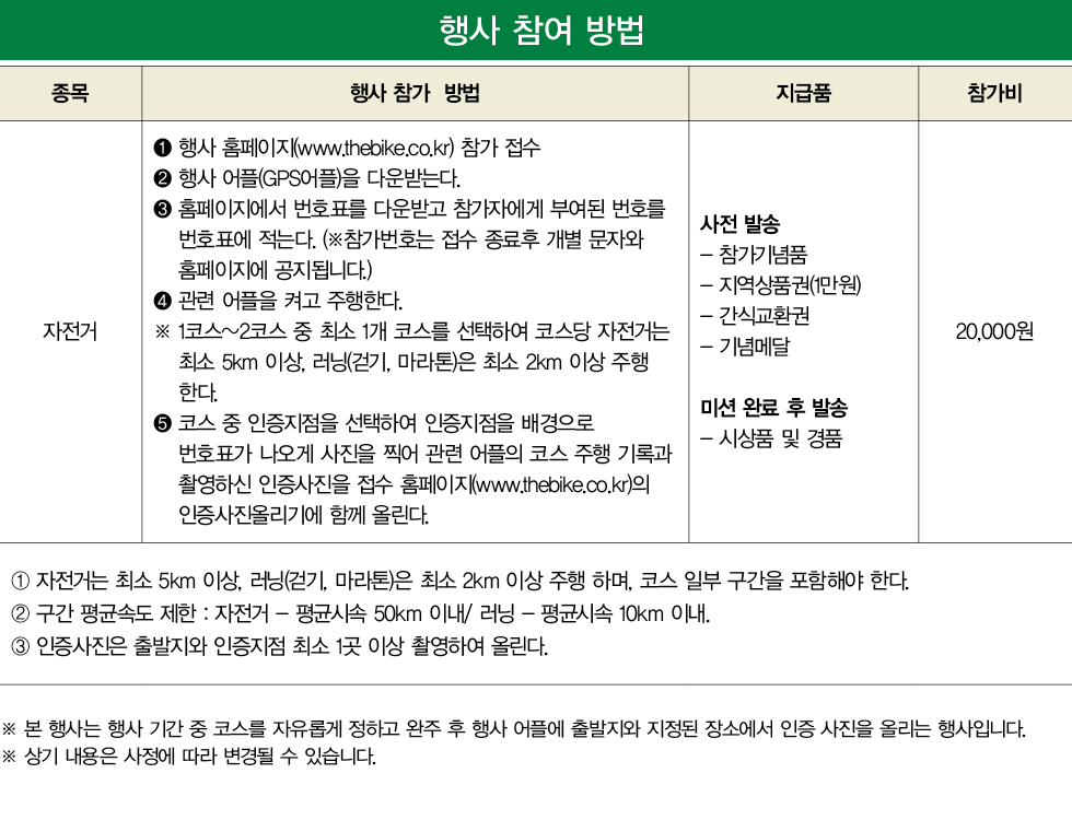 강원도 양양군 내, 주어진 코스를 완주하거나, 주어진 코스중 자전거는 최소거리 5km 이상,러닝은 최소 2km이상을 주행하여야 합니다. 행사 인증 미션은 라이딩 관련 어플을 이용하여 주어진 코스대로 라이딩하면서 각 코스별 인증지점에서 인증사진을 촬영합니다. 사용한 어플의 코스주행 화면을 캡쳐한 사진과 인증지점에서 촬영한 인증샷을 함께 더바이크 홈페이지(www.thebike.co.kr) 인증사진 올리기 페이지에 올려주세요.