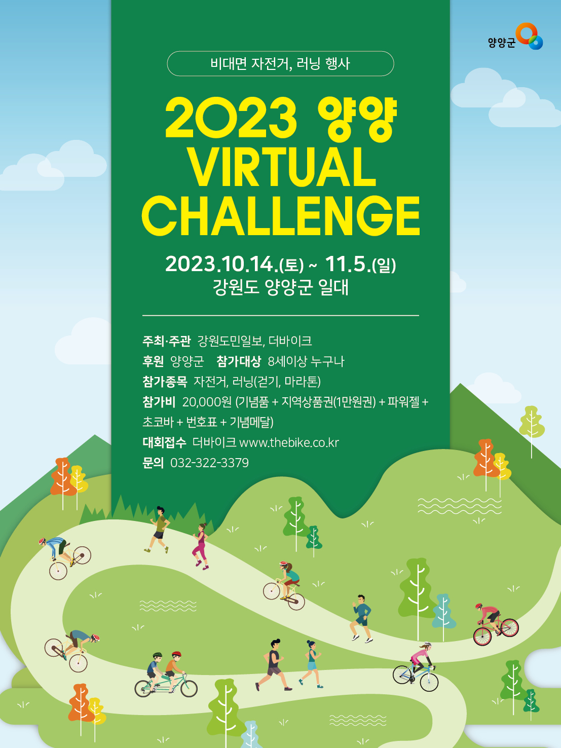 2023 양양 버추얼 챌린지는 자전거 라이딩 관련 어플을 이용하여, 행사 기간 내(2023. 10. 14(토) ~ 11. 05.(일))에 자유롭게 참여 하는 행사입니다.