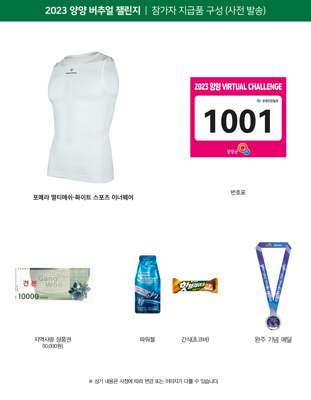 ▶참가자 지급품 발송 : 참가기념품 (이너웨어)+번호표+지역상품권(1만원)+간식교환권+기념메달