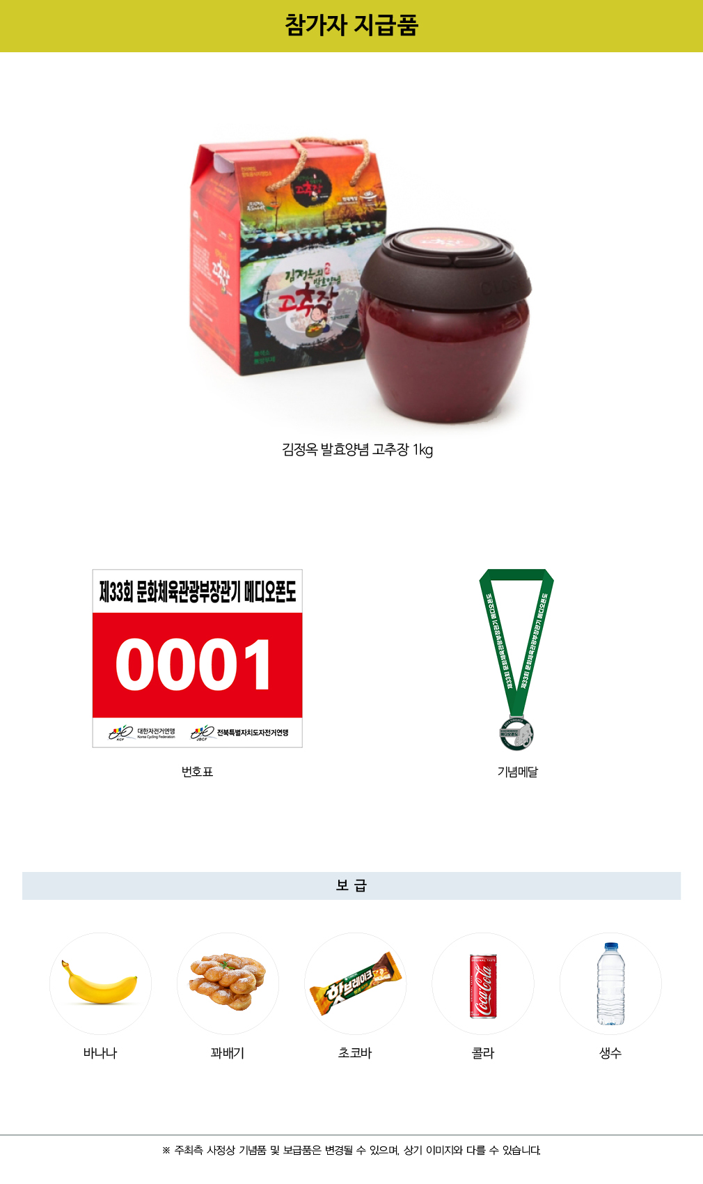 - 참가자의 부주의로 인한 안전사고 및 대회 기간 중 발생하는 사고 및 상해에 대해에선 현장 응급조치 후 가입 한 보험을 통한 보상 이외에는 청구할 수 없으며 주최/주관/후원단체에서는 책임지지 않는다.