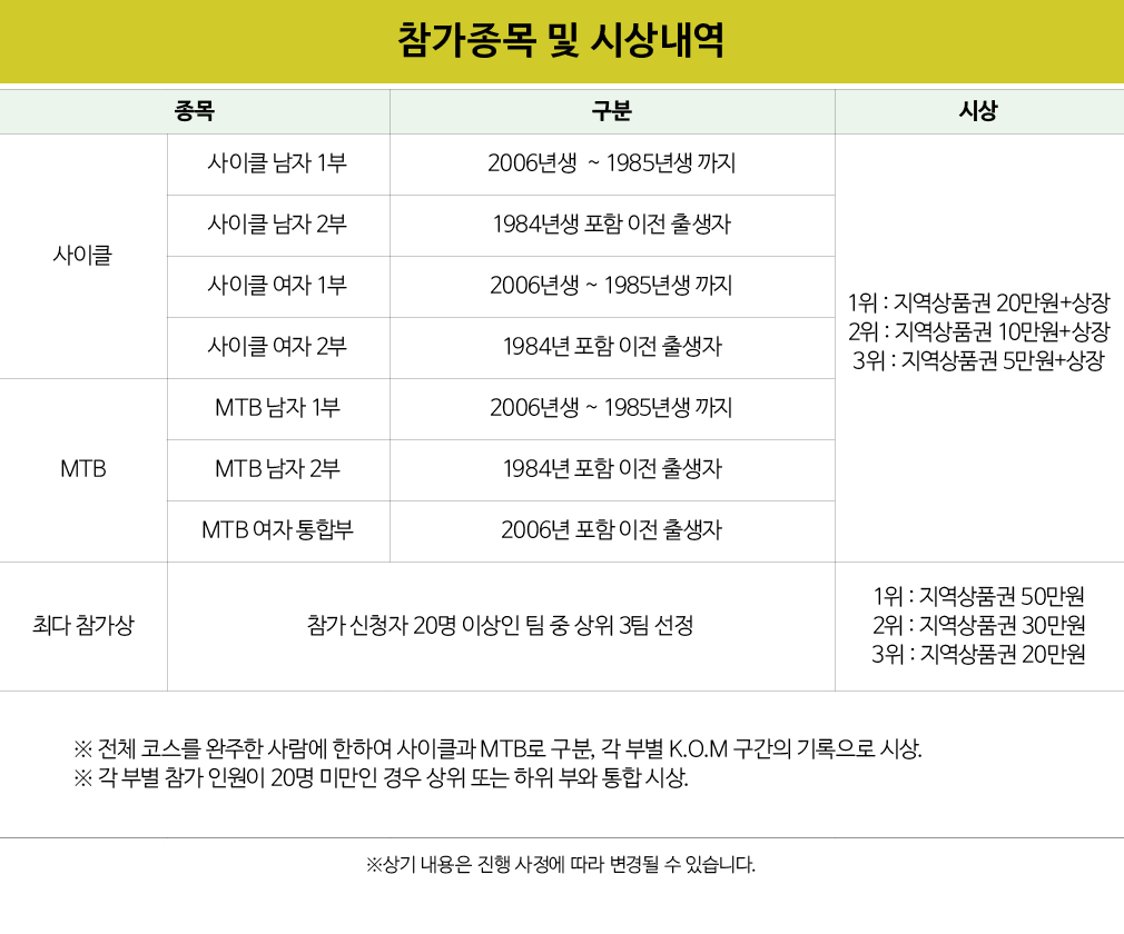 - 하이브리드 및 일반형 자전거 : MTB 부문으로 접수할 수 있으나 시상에서 제외되며, 로드타이어의 경우도 시상에서 제외한다.